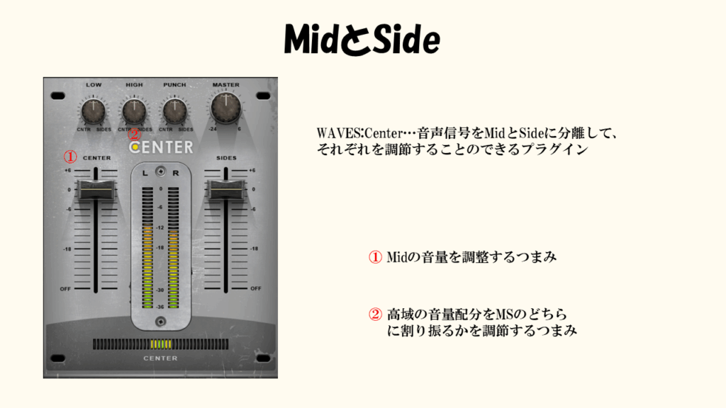 例えばWAVES社のCenterというプラグインはMidとSideの音量バランスを調整することができます。