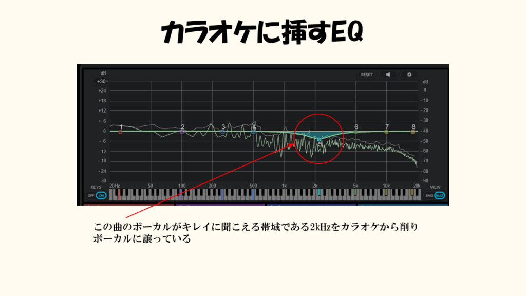 例えば、ボーカルの美味しい帯域である2〜3kHzあたりを、カラオケにEQを挿して少し削ってあげるなどして隙間を作りましょう。