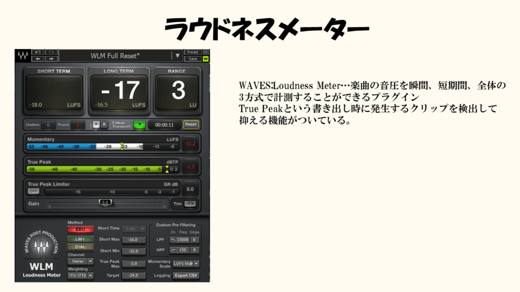 マスタリングでは基本的にはこの単位を目指す値になるようにリミッターやマキシマイザーといったプラグインを使って楽曲を調整していきます。
