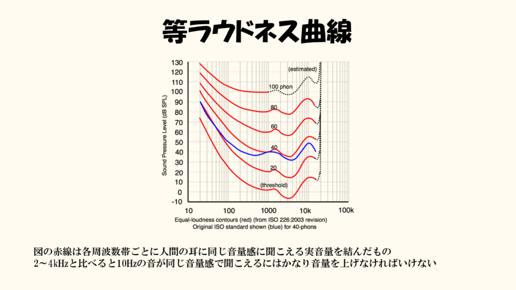 例えば、この図の赤線は各周波数帯ごとに人間の耳に同じ音量感に聞こえる実音量を結んだ線になっています。