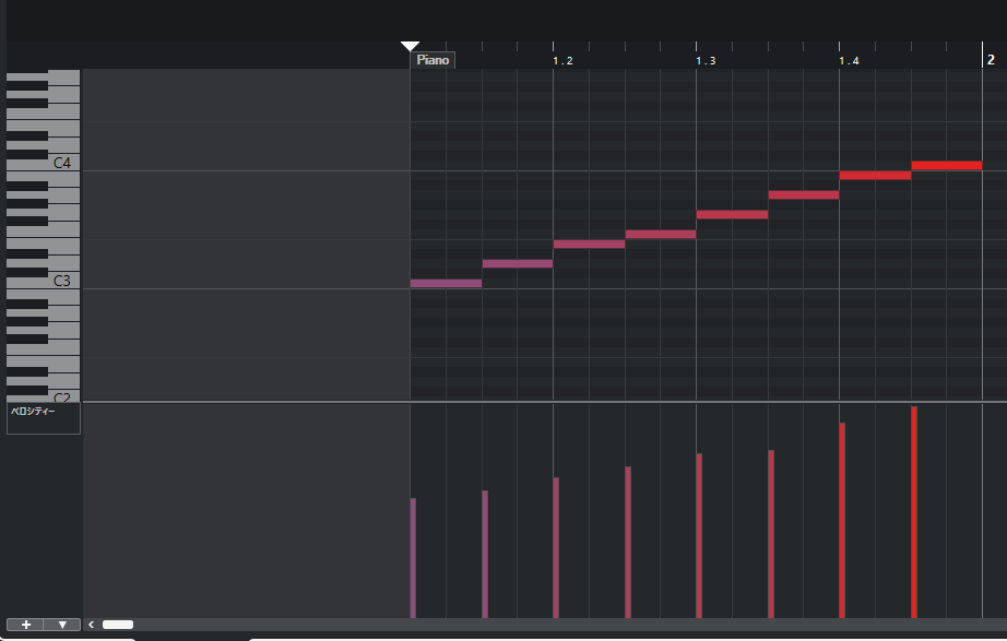 (ベロシティは、音量の大小を設定する「ボリューム」とは異なり、音の強弱を設定するパラメータです)