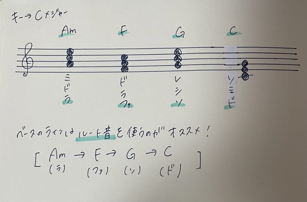 キーはCメジャー、コード進行はAm→F→G→Cとしましょう。