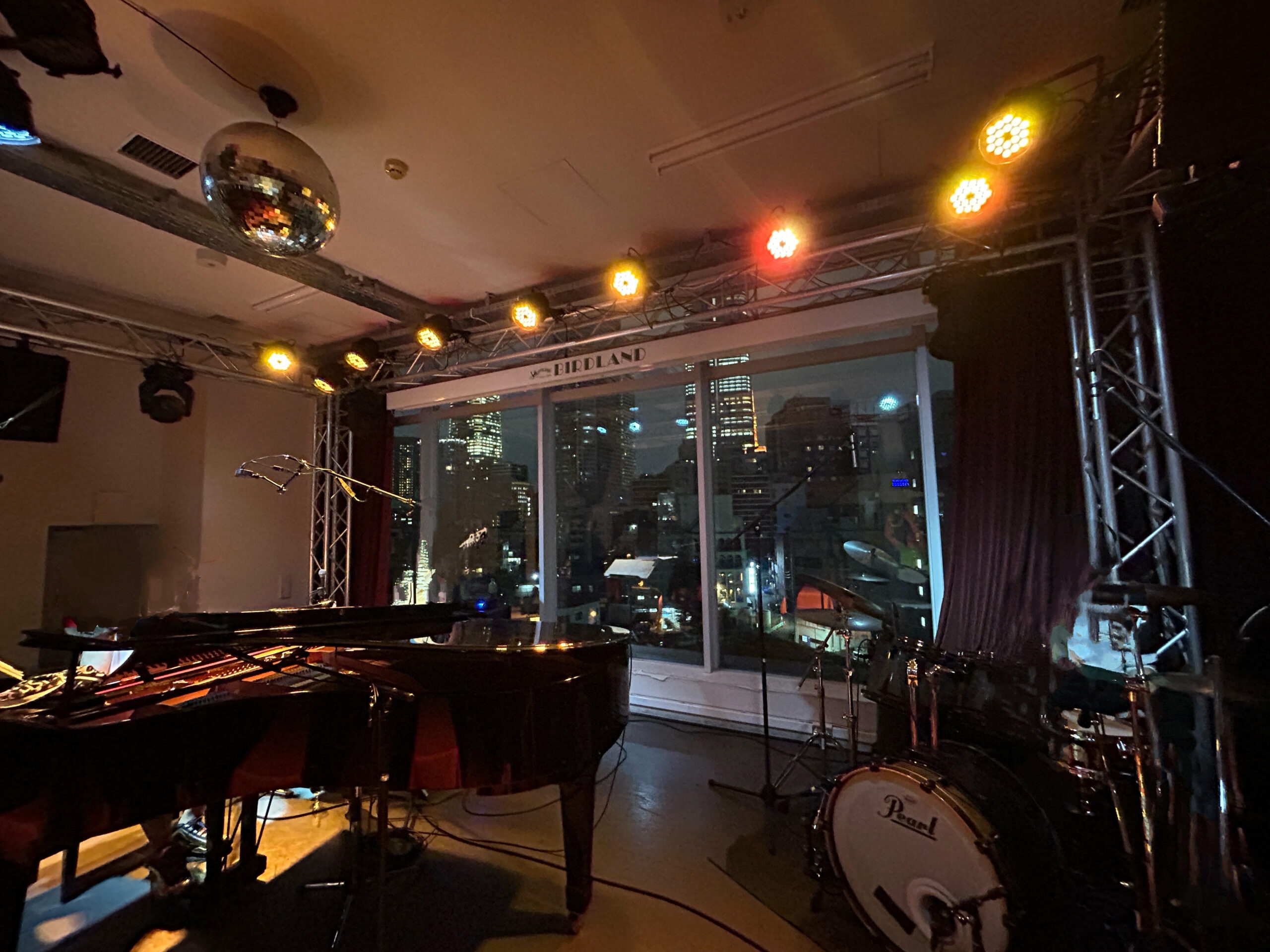六本木駅から徒歩2分の「BIRDLAND」は、ステージ後ろに大きなガラス窓があり、夜には都会の夜景を背景に演奏できます。