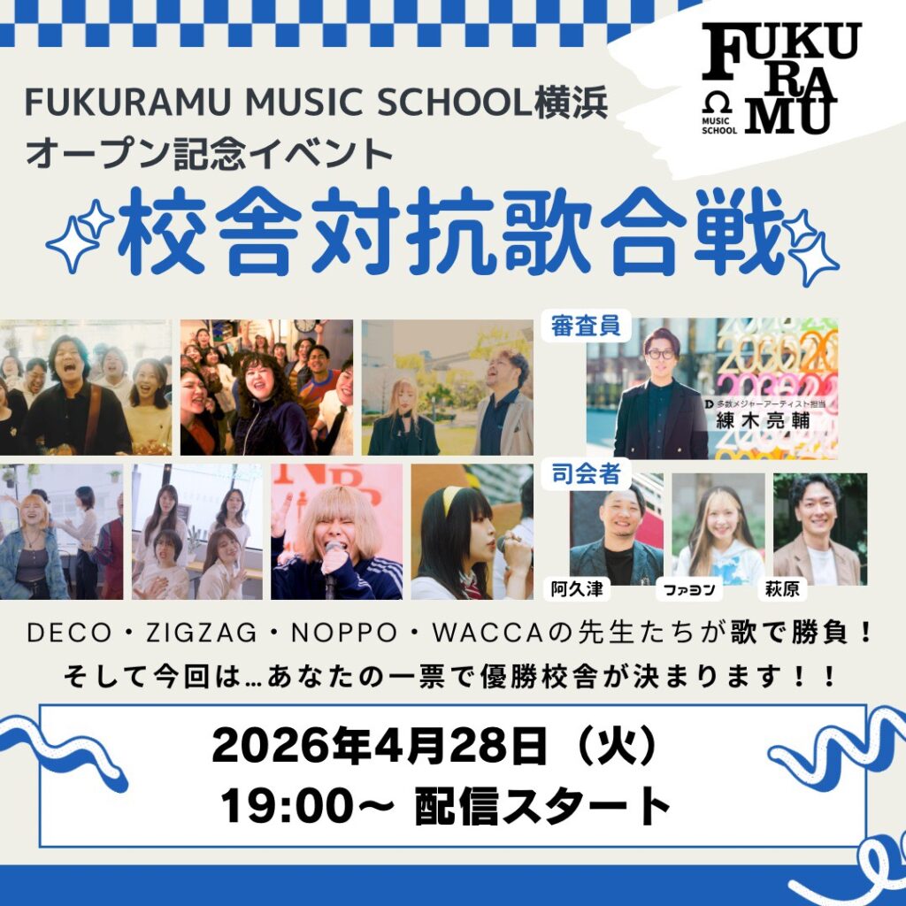 FUKURAMU MUSIC SCHOOLの開校を記念して、オープニングイベント「各校舎対抗歌合戦」を開催いたします。